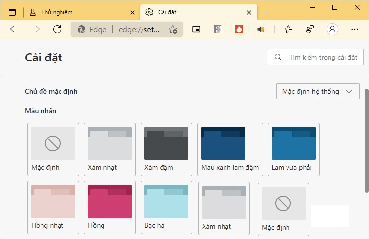 Kết quả giao diện trình duyệt Microsoft Edge đã được thay đổi theme mới. Để quay về giao diện cũ thì bạn quay lại mục Giao diện rồi nhấn lại vào Mặc định.