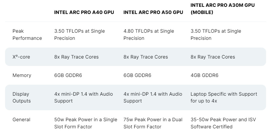Learn more about Intel Arc Pro A30M GPU for mobile, and the Intel Arc Pro A40 (single slot) and A50 (dual slot) GPUs for small-form factor desktops. #IntelArc https://t.co/nnA3X1hLjj pic.twitter.com/ZqrIpMqs92
