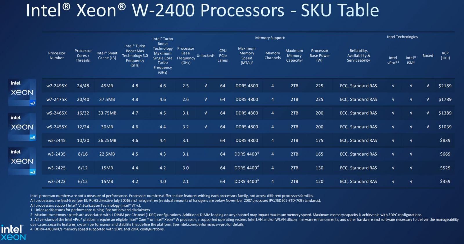 Cuối cùng về thời gian ra mắt của vi xử lý máy trạm Xeon W-3400 và Xeon W-2400, cả 2 sẽ có sẵn để đặt hàng trước từ ngày 15 tháng 2 và dự kiến giao hàng vào khoảng tháng 3 năm 2023. Mức giá đề xuất cho thế hệ vi xử lý máy trạm mới của Intel sẽ bắt đầu từ 359 USD ~ 8.5 triệu đồng (Xeon w3-2423) và tối đa lên đến 5889 USD ~ 140 triệu đồng (Xeon w9-3495X).