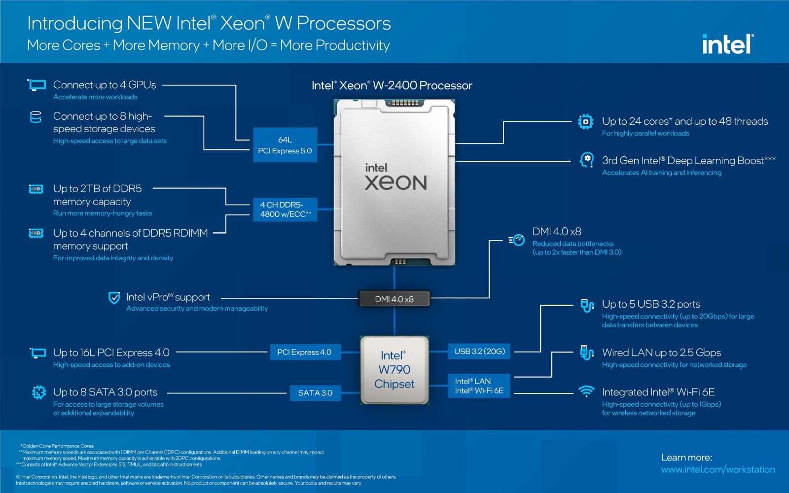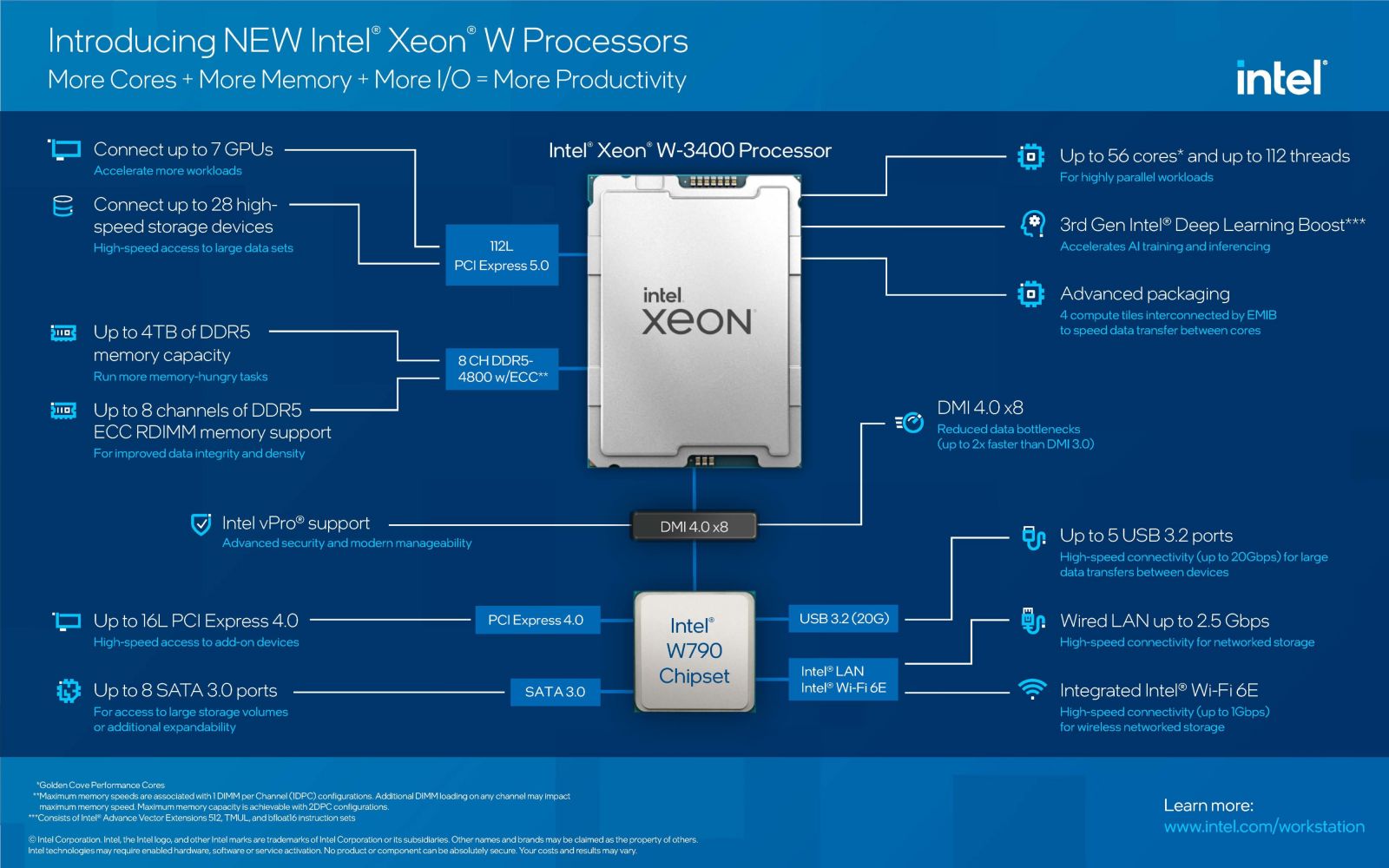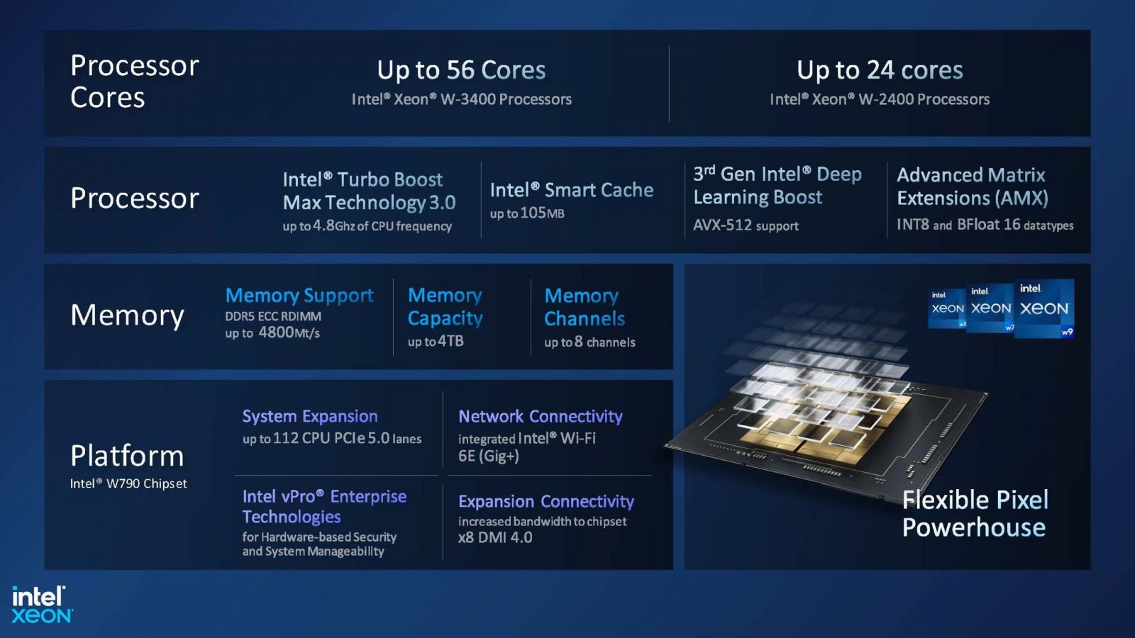 Các vi xử lý Intel Xeon W vừa ra mắt được thiết kế dành riêng với hiệu suất mạnh mẽ cho các công việc chuyên nghiệp như sáng tạo nội dung truyền thông và giải trí, thiết kế kỹ thuật và xử lý khoa học dữ liệu. Với kiến trúc điện toán mới mang tính đột phá, cải thiện hiệu suất trên từng nhân cùng cách sắp xếp và đóng gói các cụm nhân xử lý theo kiến trúc mới (EMIB). Từ đó, mang lại cho Intel Xeon W-2400 và Intel Xeon W-3400 khả năng mở rộng giúp nâng cao hiệu suất chưa từng có.
