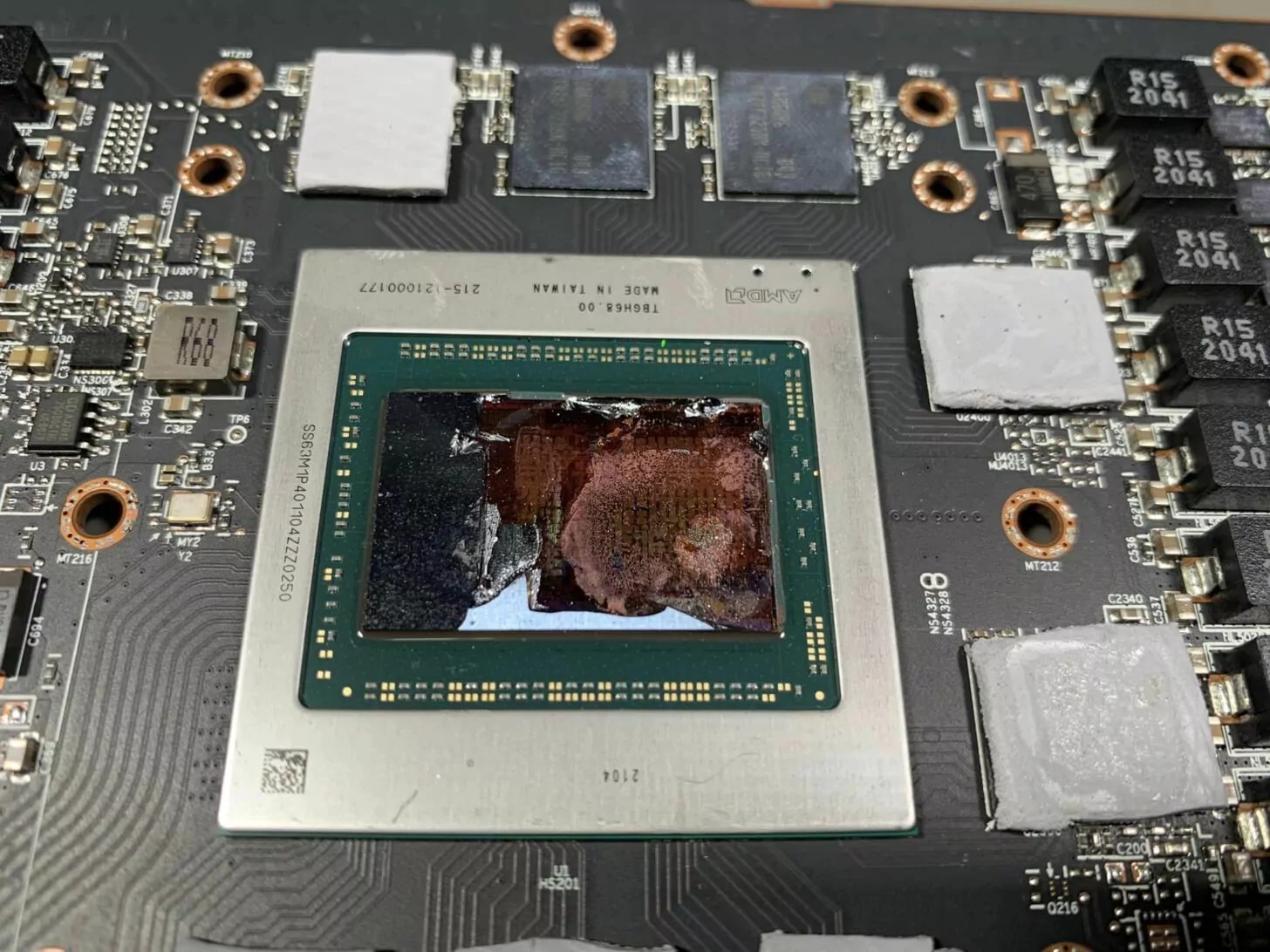 KrisFix không đề cập đến thông tin những mẫu card Radeon RX 6000 series hư hỏng là của những hãng nào sản xuất, nhưng trong clip, anh em có thể thấy thiết kế reference của mẫu card MBA (Made By AMD). Những hình ảnh chụp từ clip cũng thể hiện chip GPU bị hư hỏng khá nghiêm trọng: