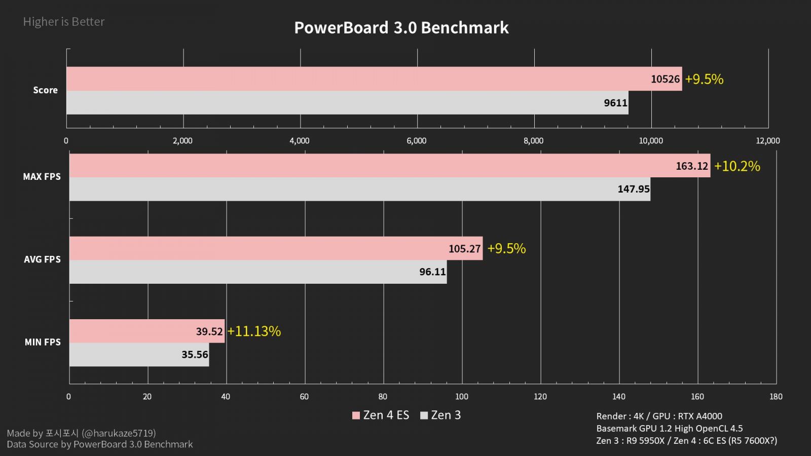 So sánh trực tiếp với chip CPU tiêu dùng cao cấp nhất của thế hệ Zen 3, Ryzen 9 5950X, những bài test hiệu năng xử lý cho thấy Ryzen 5 7600X mạnh hơn 5950X từ 9.5 đến 11.3%. Đây là điều đáng đề cập vì 5950X chạy ở xung nhịp boost cao hơn, và thậm chí còn nhiều hơn những 10 nhân xử lý. Nếu thông tin này là chính xác thì IPC của Zen 4 là bước nhảy rất ấn tượng so với Zen 3.