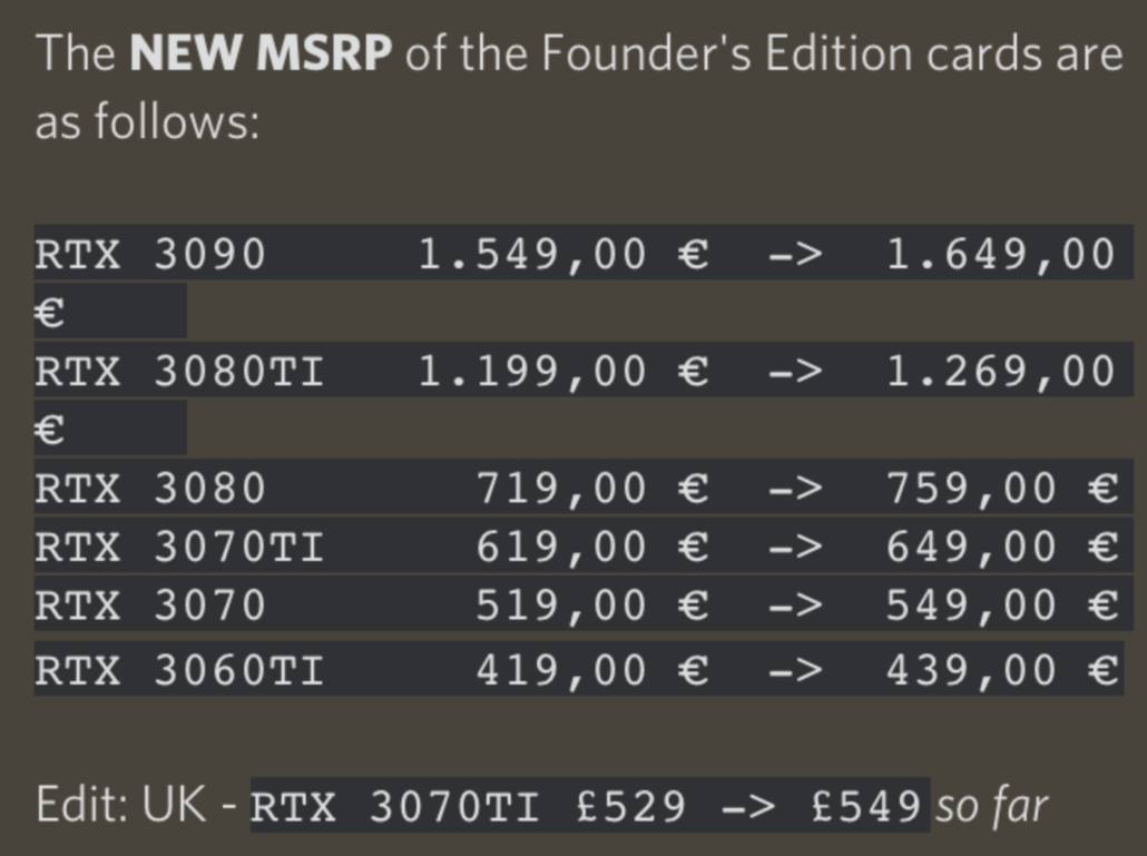 Thông tin đến từ nhóm StockDrops trên Discord. Các trang web của Nvidia Châu Âu đã được cập nhật lại giá niêm yết mới cho các mẫu RTX 30 Founders Edition. Đây chắc chắn là một thông tin không tốt với game thủ bởi thị trường tiền điện ảo đã và đang hạ nhiệt, cùng với những dự báo khả quan từ các ông lớn. Mặc dù vậy, Nvidia vẫn quyết định rằng họ có thể tăng giá VGA của mình lên cao hơn nữa.