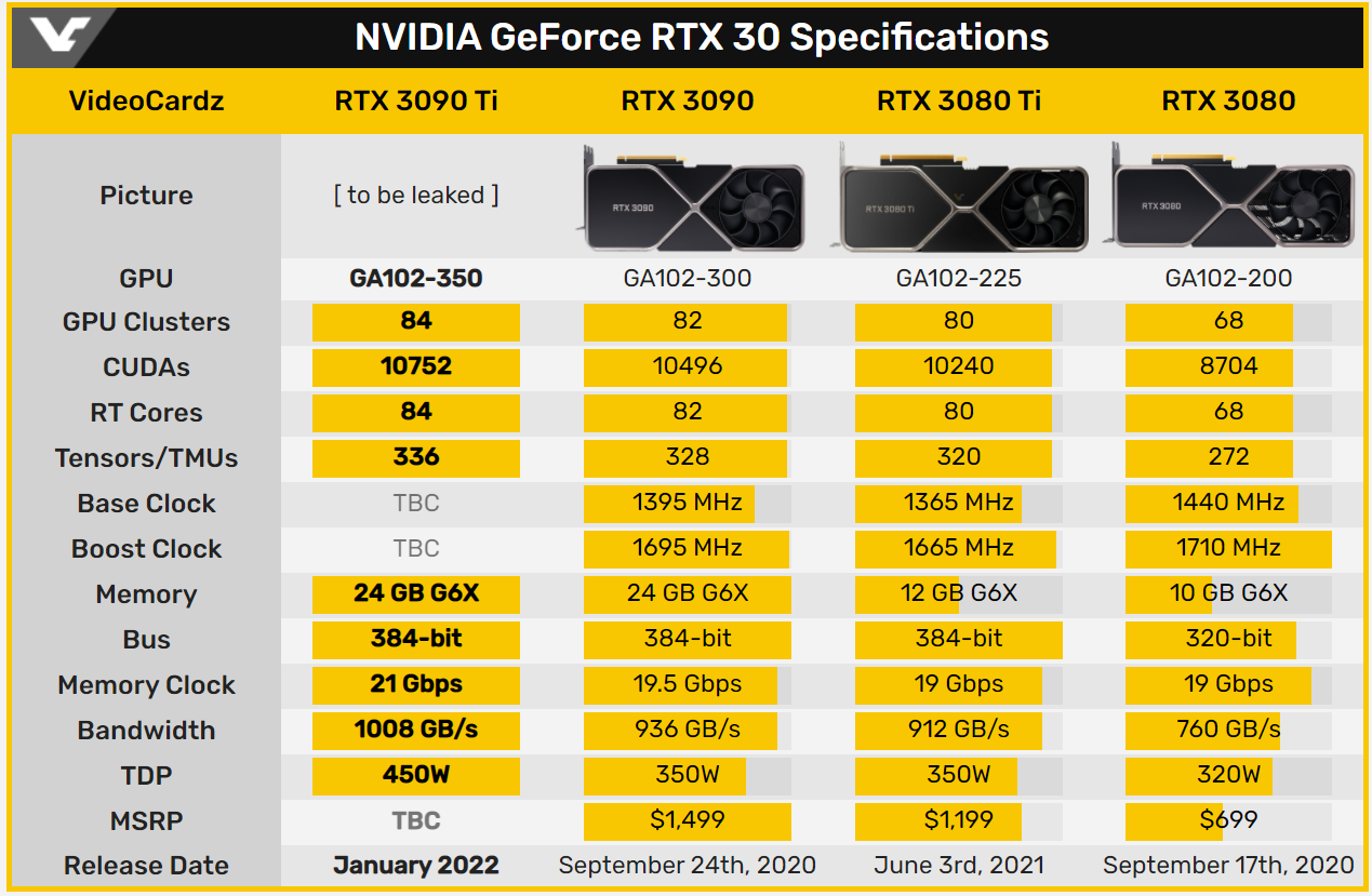 Trước đó, một tin đồn cho biết RTX 3090Ti sẽ có mức tiêu hao năng lượng lên đến 400W, cao hơn 50W so với GeForce RTX 3090 hiện tại, có nghĩa là chúng sẽ cung cấp GPU và VRAM với xung nhịp nhanh hơn.