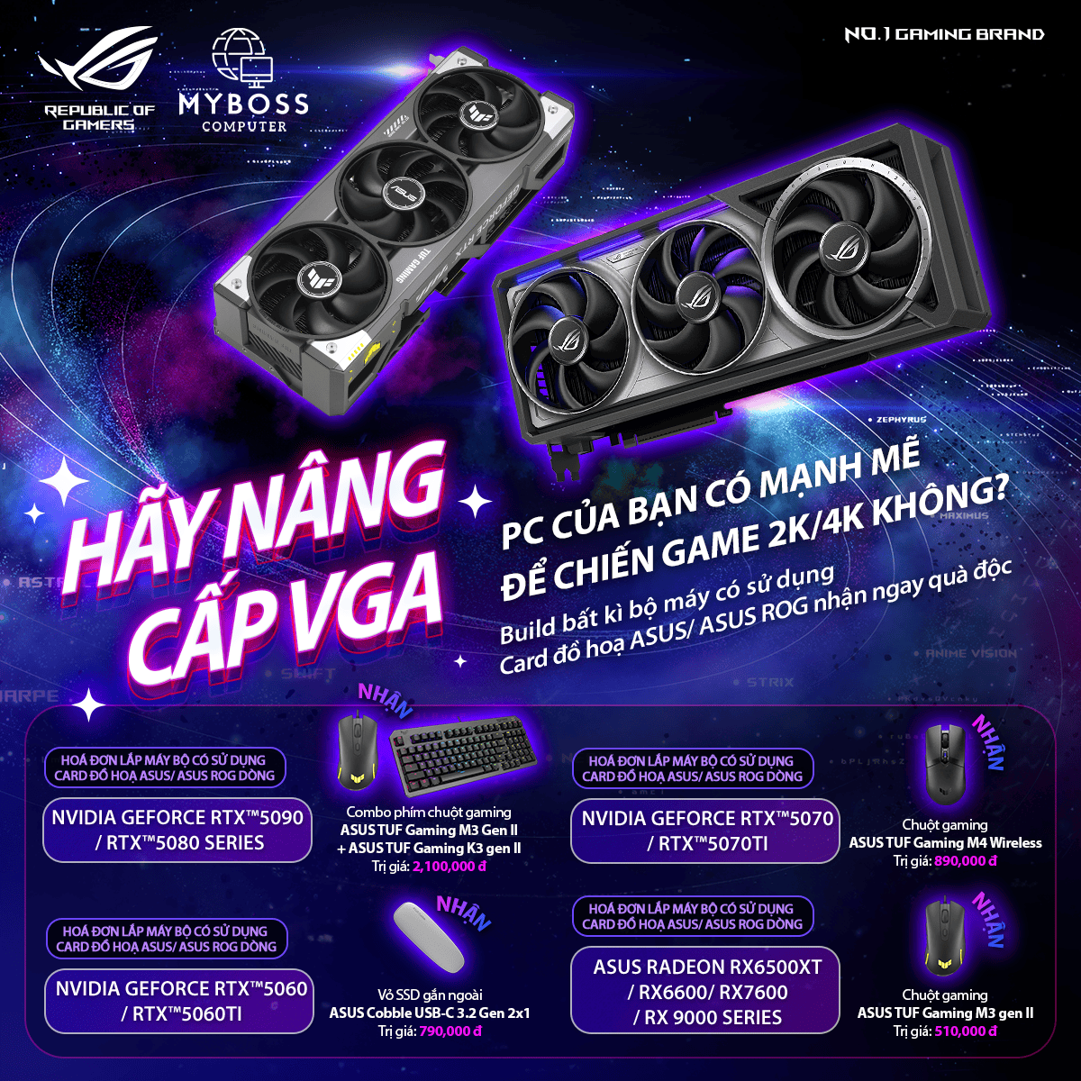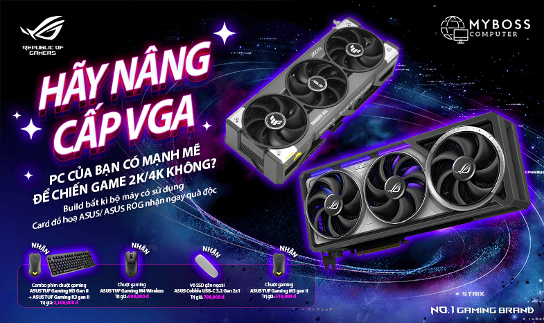 MYBOSS phối hợp cùng ASUS hân hạnh gửi tới quý khách chương trình khuyến mại “Build/ nâng cấp bất kì bộ máy có sử dụng Card đồ hoạ ASUS hoặc ASUS ROG nhận ngay quà độc”.