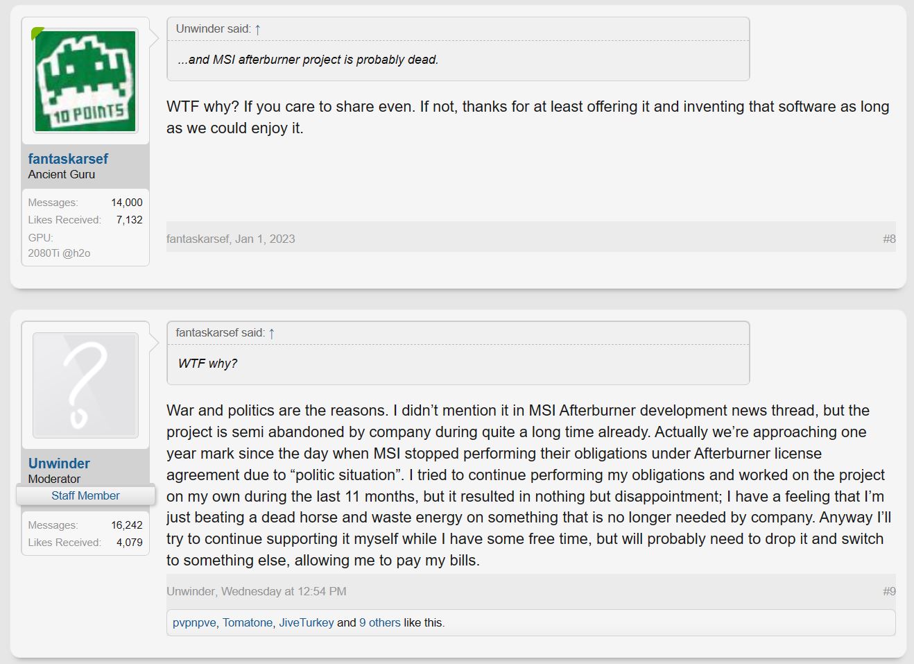 Nhà phát triển người Nga tuyên bố trên các diễn đàn rằng dự án đã bị MSI "bỏ rơi" trong 11 tháng qua và anh ấy vẫn cố gắng hỗ trợ phần mềm này với danh nghĩa cá nhân, một cách không công nhưng chắc không thể tiếp tục lâu hơn. Tuy nhiên trong thời gian gần đây, tình hình ngày càng trở nên khó khăn hơn với anh ấy và anh ấy không thể nỗ lực nhiều hơn nữa dự án khi anh ấy phải thanh toán các hóa đơn của mình, v.v...Trên diễn đàn Guru3D Forums, nhà phát triển này chia sẻ: