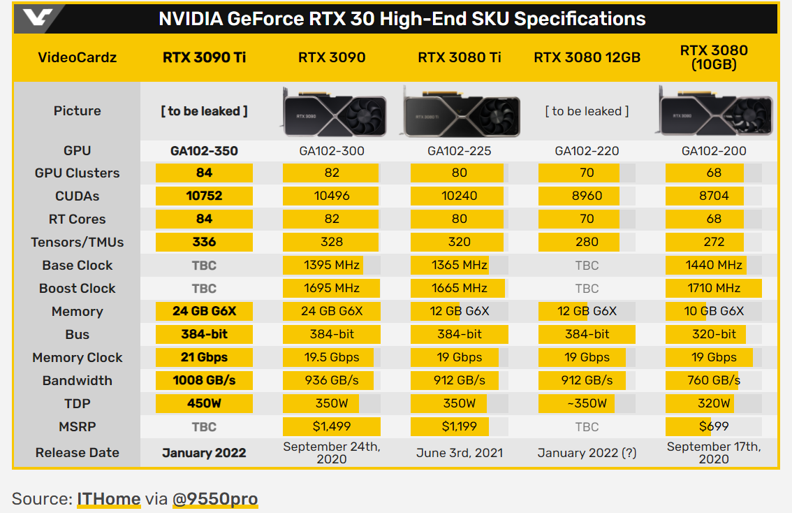 Nếu không có gì thay đổi GeForce RTX 3090Ti sẽ ra mắt ngay trong tháng 1/2022, trở thành mẫu card đồ họa chơi game đầu bảng trong dòng Ampere của NVIDIA nói riêng, và có lẽ trên toàn thị trường nói chung. RTX 3090Ti được kỳ vọng sẽ trở thành một phiên bản hoàn hảo hơn của RTX 3090 hiện tại, vốn cũng đang được đánh giá rất cao. Đồng thời cung cấp hiệu suất tốt hơn nhờ được trang bị VRAM GDDR6X thế hệ mới.