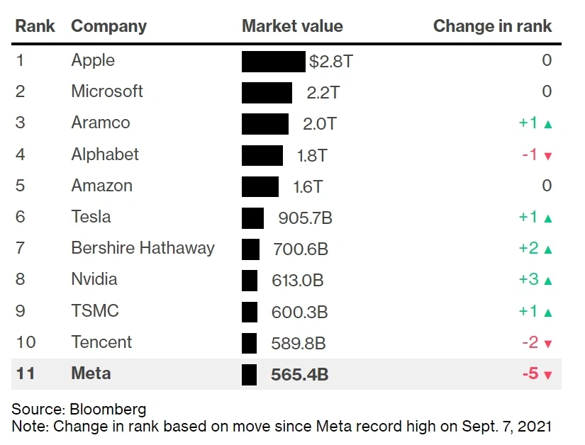 Trong tháng qua, giá cổ phiếu của Meta Platforms Inc. giảm tồi tệ nhất trong lịch sử khiến công ty mẹ của mạng xã hội Facebook không còn nằm trong top 10 công ty lớn nhất thế giới về giá trị vốn hoá thị trường.