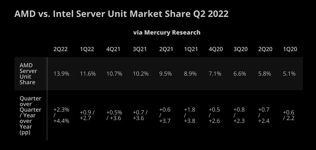 Vẫn là con số 2,3% chính là tăng trưởng mảng chip xử lý máy chủ của AMD. Đây là con số tăng trưởng lớn nhất của AMD kể từ khi Mercury Research tổng hợp thông tin thị trường từ năm 2017.