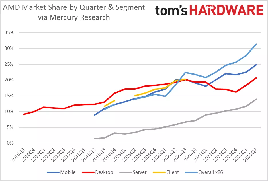 Theo kết quả phân tích thị phần CPU của Mercury Research trong quý 2 năm 2022, các lô hàng CPU cho máy tính để bàn đã giảm xuống mức thấp nhất trong gần ba thập kỷ. Sự sụt giảm xảy ra có nguyên nhân chủ yếu do các OEM giảm hàng tồn kho, dẫn đến giảm mạnh nhu cầu. Khảo sát thị trường cho thấy, cả sản lượng sản xuất lẫn nhu cầu thị trường trong ba tháng từ 4 đến 6/2022 đều tuột dốc.