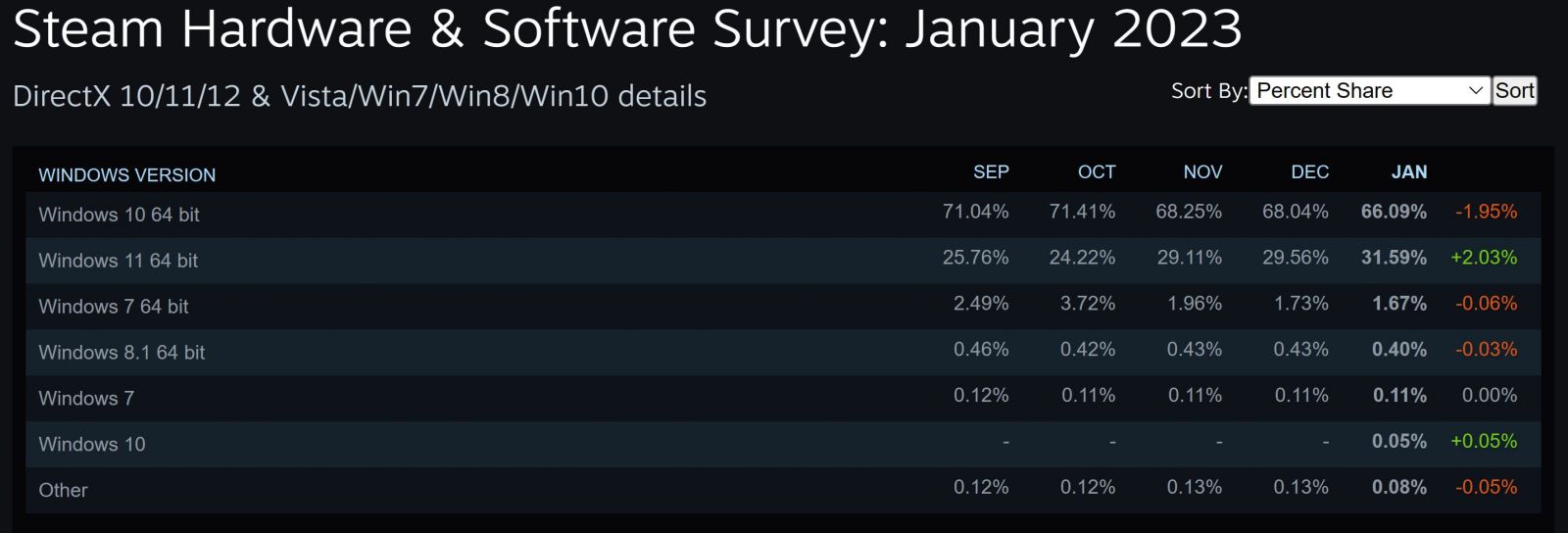 Windows 10 x64 vẫn là hệ điều hành chiếm tỉ lệ áp đảo trên nền tảng Steam, với 66.09% vào tháng 1/2023, giảm 1.95% so với cuối năm trước. Windows 11 dần được sử dụng nhiều hơn, tăngt ừ 29.56% hồi tháng 12/2022 lên 31.59%. Windows 7 x64 và Windows 8.1 x64 vẫn còn game thủ sử dụng, nhưng dần chuyển đổi sang các phiên bản hệ điều hành mới hơn, mức giảm tương ứng 0.06% và 0.03%, còn 1.67% và 0.4%. Tuy nhiên, điểm chính đáng nhắc đến vẫn là ở phần cứng, cụ thể là card đồ họa, với hệ thống sử dụng tập lệnh DirectX 12/11/10.