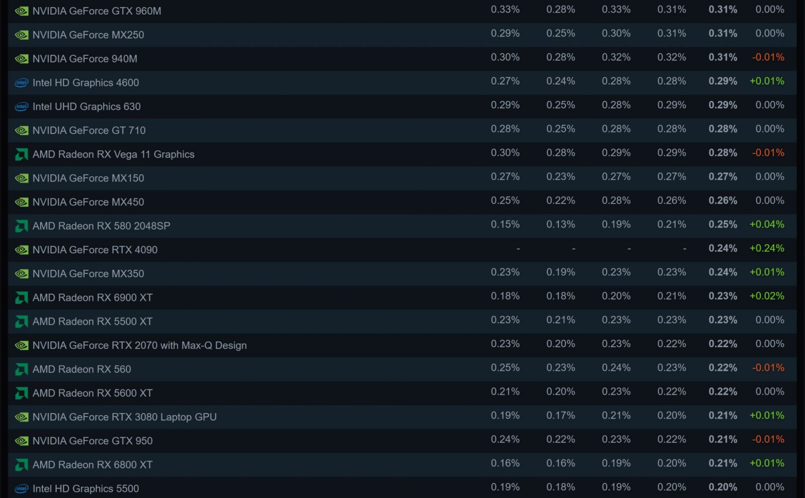 Mẫu card đồ họa Ada Lovelace mạnh nhất - GeForce RTX 4090 - lần đầu tiên xuất hiện trong bảng thống kê phần cứng trên nền tảng Steam, với con số có thể nói là rất ấn tượng. Steam Hardware & Software Survey tháng 1/2023 cho thấy có 0.24% người dùng đang sở hữu RTX 4090 cho hệ thống máy tính chơi game. Điều đáng chú ý là danh sách hoàn toàn vắng bóng AD102 GPU kể từ khi ra mắt chính thức hồi tháng 10/2022, dường như kết thúc 1 năm làm việc, nhiều người đã tự thưởng cho bản thân 1 sản phẩm đầu bảng về đồ họa, cũng như đã có đủ lượng thông tin để đi đến quyết định mua hàng.