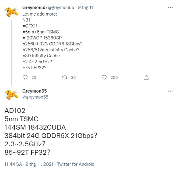Thì nay leaker này đã công bố thêm dòng RTX 40-series sẽ sủ dụng GPU AD102 sẽ được sản xuất theo công nghệ 5nm với 18432 nhân CUDA, xung nhịp từ 2,3 - 2,5 GHz. Hiệu năng tính toán FP32 đạt từ khoảng 85 đến 92 TFLOPS trong khi GA102 của RTX 3090 hiện chỉ đạt 35,5 TFLOPS chỉ bằng một nửa!