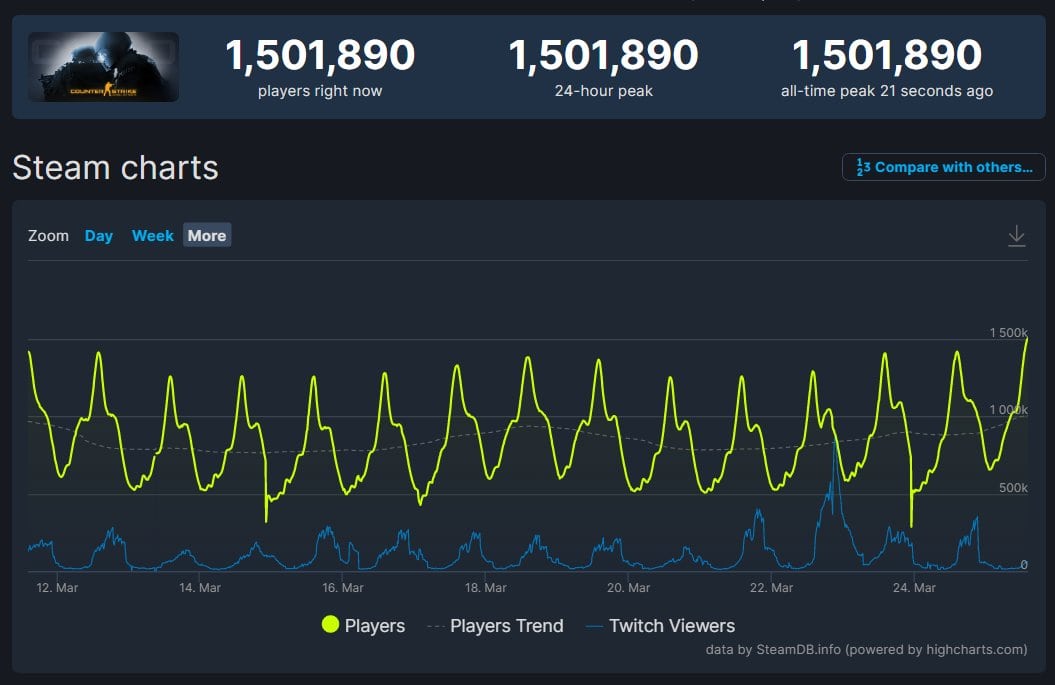 Do sự kết hợp của những yếu tố đó cùng với tin tức gần đây về Counter-Strike 2, CS:GO đã phá vỡ kỷ lục trước đó về số người chơi đồng thời trên Steam là khoảng 1.350.000 vào tháng 2. Số lượng người chơi CS:GO cao nhất hiện nay là 1.507.212 người chơi đồng thời một cách đáng kinh ngạc, mặc dù con số này đã giảm xuống gần một nửa vào cuối ngày. Kỷ lục này đưa CS:GO lên vị trí thứ hai về lượng người chơi đồng thời mọi thời đại, chỉ cao hơn kỷ lục 1.324.761 của Lost Ark nhưng đứng sau kỷ lục khổng lồ 3.236.000 của PUBG. Tuy nhiên, CS:GO đã hoàn toàn phá vỡ số lượng người chơi hiện tại của cả hai trò chơi đó, với Lost Ark đạt đỉnh chỉ 94.860 trong khi con số ấn tượng vẫn là 454.795 người chơi đã đăng nhập vào PUBG trên Steam.