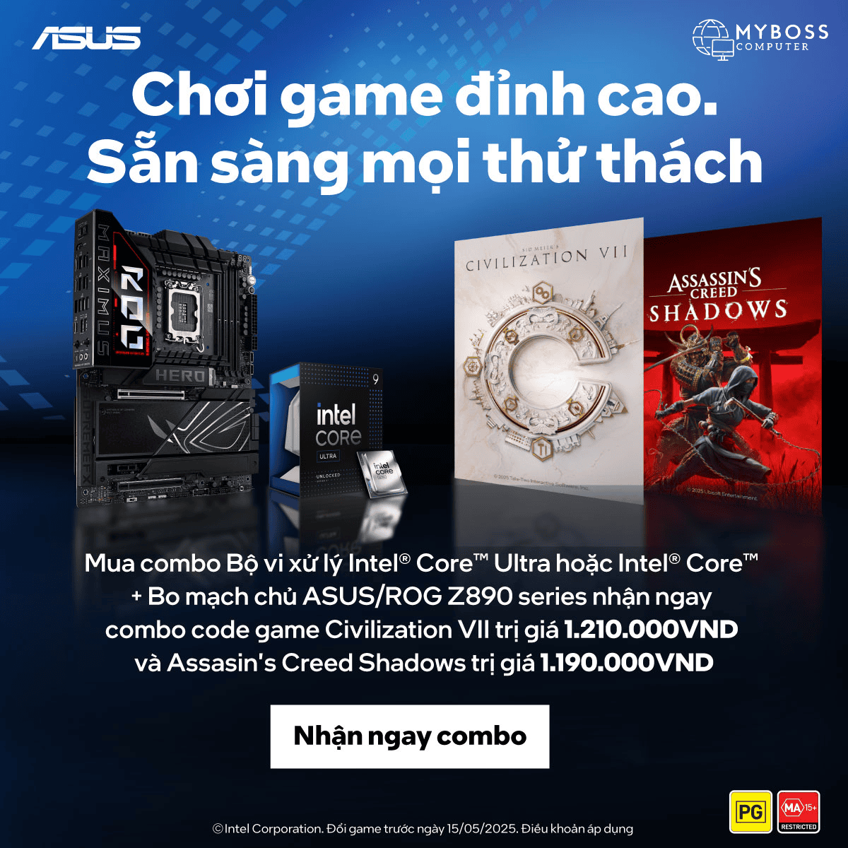 Mua combo Bộ vi xử lý Intel® Core™ Ultra hoặc Intel® Core™ + Bo mạch chủ ASUS/ROG Z890 series bất kì (Prime/ TUF/ ProArt/ ROG) nhận ngay code game Civilization VII trị giá 1,210,000đ và Assasin's Creed Shadows trị giá 1,190,000đ.