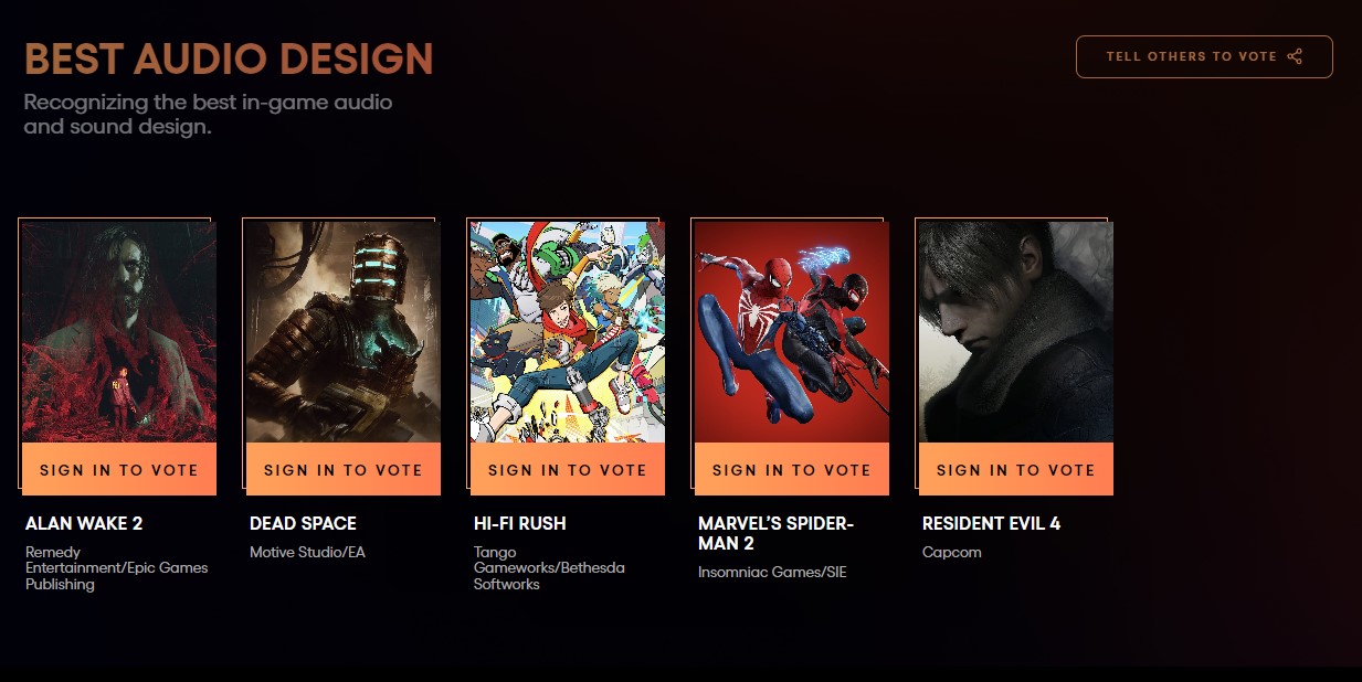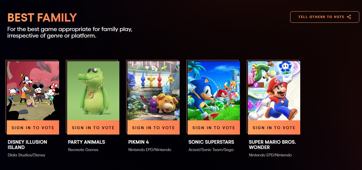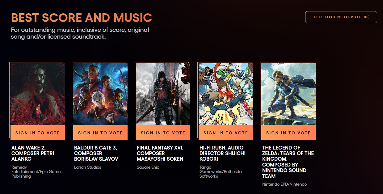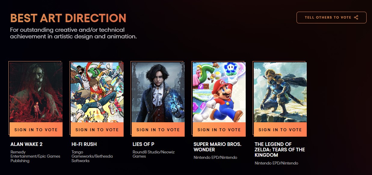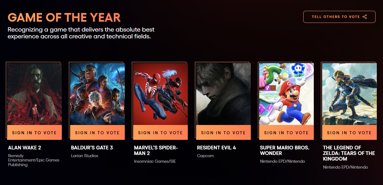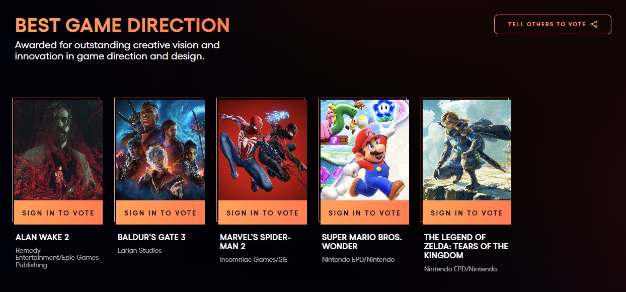 Trong năm nay, Nintendo đang là nhà phát hành có nhiều đề cử nhất với 15 đề cử. Alan Wake 2 và Baldur’s Gate 3 là 2 tựa game dẫn đầu với 8 đề cử ở mỗi hạng mục.